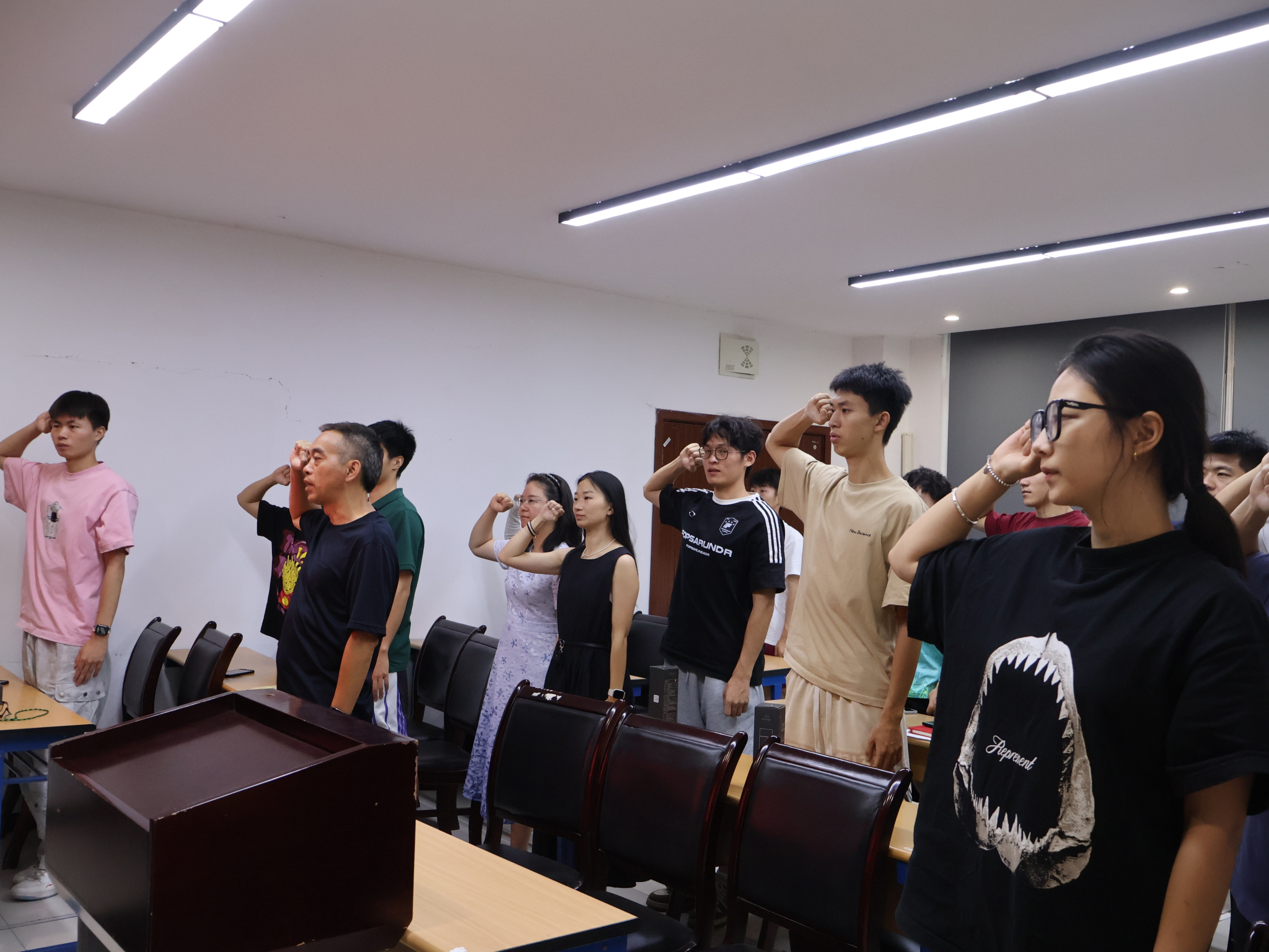 离校教育结束后,新党员入党宣誓仪式正式举行。在李永的领誓下,多位新党员面向党旗庄严宣誓:“我志愿加入中国共产党,拥护党的纲领,遵守党的章程……为共产主义奋斗终身,随时准备为党和人民牺牲一切,永不叛党。” 铿锵有力的誓词在会议室回荡,彰显了新党员对党的忠诚与信仰。