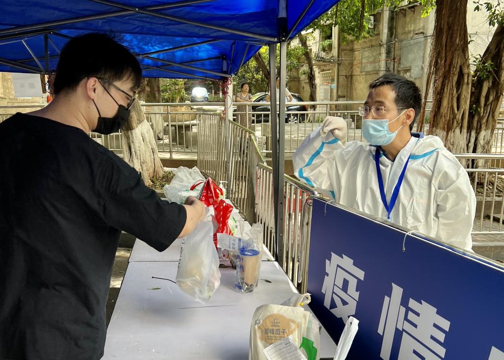 明兴建协助负责学校后勤保障工作,落云柯负责A区物资保障志愿者,冉峰在物资转运组帮助校外物质转运进学校,并放置于转运点。幸昊在B区科学会堂协助核酸采集扫码,冯杰在A区新华园社区值守。关丽静在A区大门做社区居民物资保供小组志愿者,负责把居民采购的物资从校门口转运到校内分发点。