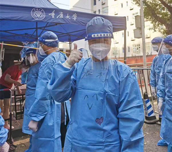 “能轮到我吗?这么伟大的事情,我不怕死,我不怕热,我是党员!!”看到教工群志愿者报名,刚来学院不久的海外归来博士后李圳程立刻踊跃报名。他和张莉从虎溪校区到C区支援,是本次志愿者风险较高,工作较为严峻的地方。他们的职责是为密接的学生运送餐食和水,每天穿着密不透风的防护服爬到8楼,一干就是几个小时,一天下来汗水浸湿的衣裳,双手在在防护手套里被汗水泡到泛白发皱。