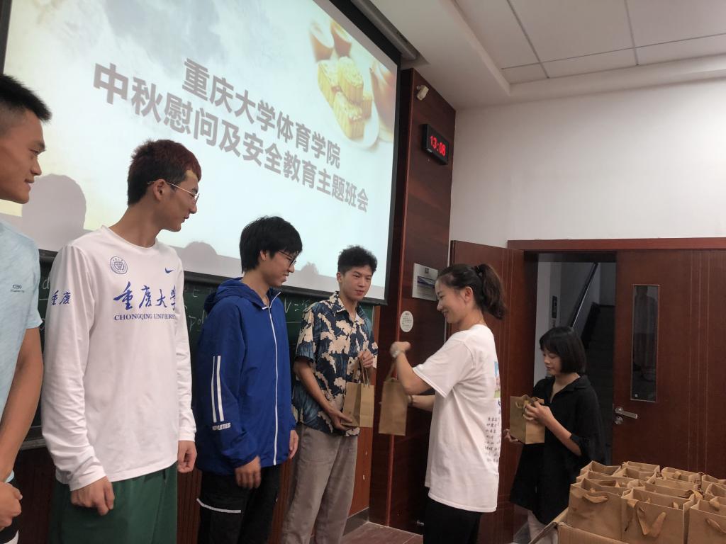 虎溪校区第一教学楼D1146举行中秋慰问及安全教育主题班会。本次班会由本科生辅导员汤婕、辅导员助理曾佳主持,2019、2020级本科生全体参与。